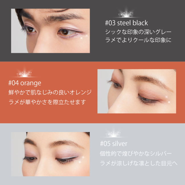 今回発売のアイライナーはどんな場面でも使いやすいノーマルなカラー2色に加え、よりメイクを楽しむためのアイテムとしてラメ入りカラーの3色を展開。