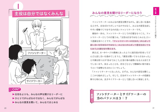 本書は話し合いの進行役であるファシリテーターの技術(ファシリテーション)について解説しています。授業やアクティブラーニングなどで話し合いの機会が増えている10代に向けた書籍です。グループワークや学級会など合意形成や話し合いの場を主軸に、学校生活の様々な場面で円滑にコミュニケーションを進めるためのコツを紹介しています。発言するのが苦手な人もスムーズに意見を言える、上手に司会ができる、チームワークを高めるなどの話し合いを可能とする、大人になっても役に立つ技術の「ファシリテーション」を習得するためにこの本がサポートします。