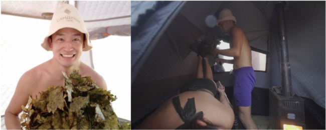 テントサウナ内のベッド上に横たわりヴィヒタで全身を叩いたり、押し当てたり、なでたりするマッサージ。 葉っぱの香りや全身が温められることで深いリラックス効果がある。