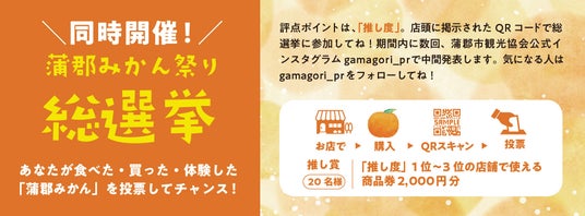この夏に開催された氷ってる系甘味の祭典「がま氷博覧会」(同協会主催)で好評だった総選挙については、今回も実施!今回の評価ポイントは「推し度」。参加店舗の商品をご飲食、ご購入された際に「これは推せる!」と感じた気持ちを店頭に置かれているQRコードから投票。届いた「推し度」はランキング形式で蒲郡市観光協会の公式SNSにて随時発表します。こちらも参加者の中から抽選で20名様に「推し賞」として蒲郡みかん祭り総選挙トップ3に輝いた店舗で使える2000円分の商品券をプレゼント。