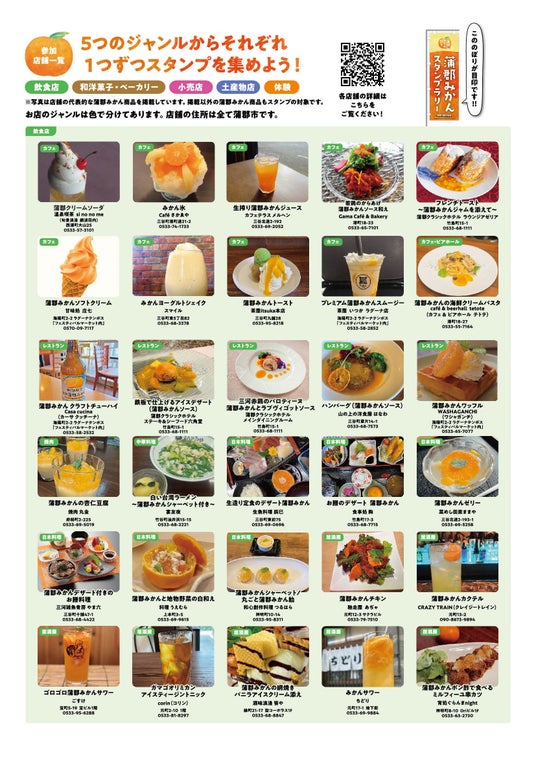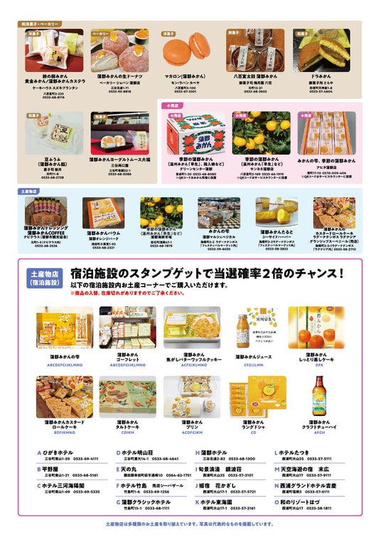 さらに、「蒲郡みかん祭り」では、各参加店でご飲食・ご購入いただいたお客様が豪華景品を獲得できるウェブスタンプラリーを開催。景品として、「蒲郡温泉郷賞」では温泉ペア宿泊券を2組様に、「参加店舗賞」では体験ジャンル施設を除いた参加61店舗で使える各店の2000円分の商品券を61名様にプレゼント。なんと、体験イベントにご参加の皆様及び、遠方からいらして、宿泊施設土産物店をご利用いただいた皆様には当選確率2倍のチャンスをご用意いたしました。各ジャンルを満遍なく楽しんでもらえる企画となっています。