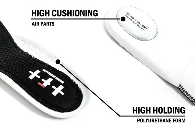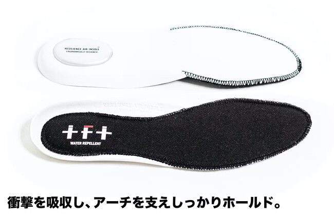 インソールには、人間工学に基づいた〈RESILIENCE AIR SOLE(レジリエンスエアソール)〉を採用。歩行時にエアーパーツが衝撃を吸収し、アーチを支え、かかとから土踏まずにかけてしっかりホールド。膝や腰への負担を軽減する設計になっています。また、素材にポリウレタンフォームを使うことで優れたクッション性も兼備させました。