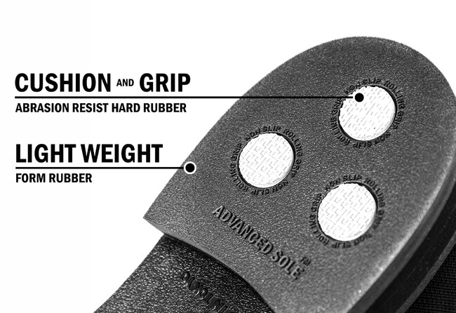 アウトソールには歩行時の動きに基づいて設計された〈ADVANCED SOLE(アドバンスドソール)〉を採用。軽量かつ衝撃吸収性に優れた発泡ゴムをベースに、耐摩耗性の高い硬質ゴムを適所に配置。クッション性とグリップ性を同時に備えているのが特徴です。特にかかと部分には摩耗に耐える素材配合になっています。水はけがよく、雨の日のはき心地も快適です。