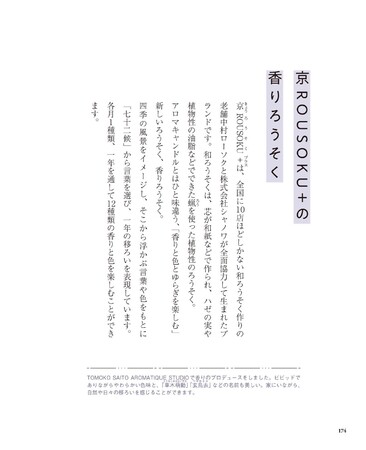 “香りとは”という基本的な知識や国内外での香りの歴史、合成香料と天然香料の違いや覚えておきたいアロマの図鑑、そして調香のメソッドなども、この本では、“香り”のことを知りたい、もっと生活に取り入れたい、という全ての方に、毎日の暮らしを心地良くするための香りの楽しみ方を紹介いたします。