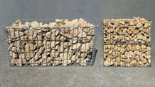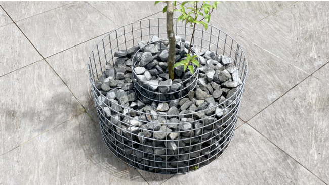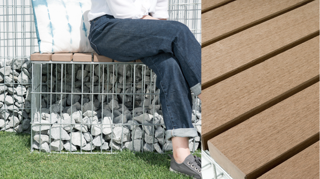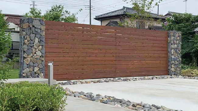 スチールのワイヤーをメッシュ状に編み込んだパネルを立体的に組み上げた箱の中に、自然石を入れることで、自然と調和した外構を演出するエクステリアです。石だけでなく、木や炭など中に入れるものを変えることで雰囲気を変えることができ、植栽との相性も良いため緑が多い外構のデザインにも溶け込みます。ガビオンベンチやガビオンサークルなどの製品は工事不要で簡単に設置することができ外構計画の幅が広がる製品です。