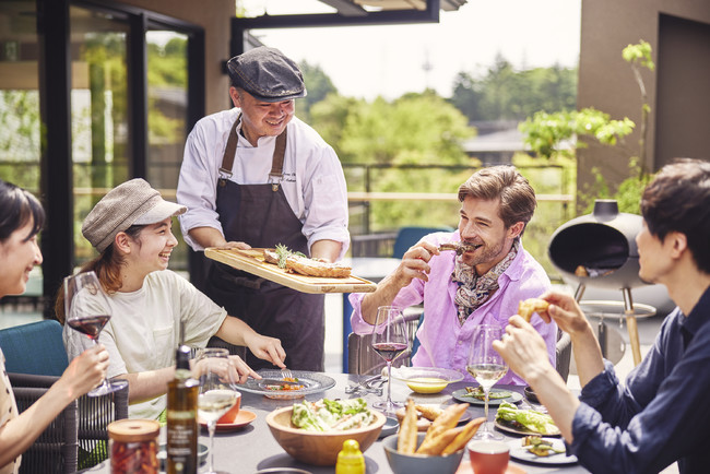 メニューは、新鮮な地野菜を使った「軽井沢コスレタスのシーザーサラダ」や「軽井沢野菜の薪グリル」、信州産の食材を堪能できる「信州サーモンのタルタル」や「信州ポークのトマホーク グリル」など、地元食材にこだわった構成です。事前予約が必須で、ランチ・ディナー各2組限定となります。(宿泊者以外の方もご利用可能)