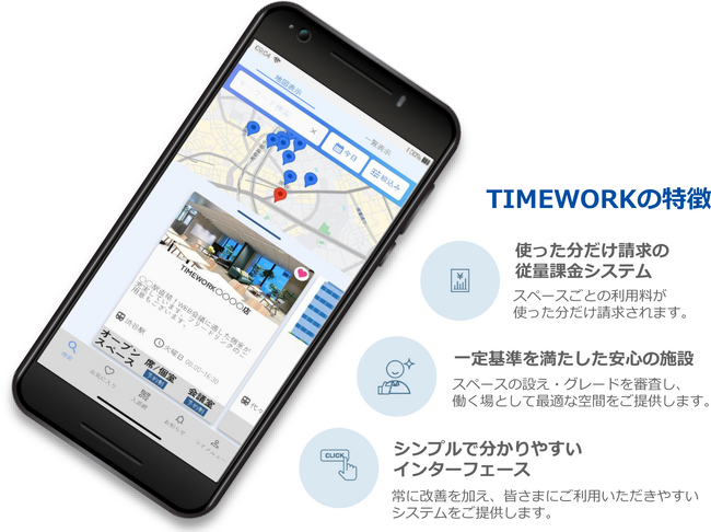 「TIMEWORK」は、法人向けスペースシェアリングプラットフォームです。加盟登録されたシェアオフィス等の中から、時間単位の課金制で各施設をご利用できます。
