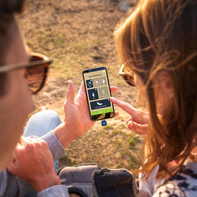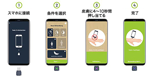 スマホにUSBデバイスを差し込み、アプリを使用して皮膚に4~10秒間当てるだけでOK。従来の化学物質を含む薬品は不要。