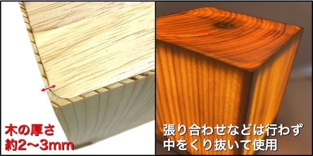 木目プリントや切断した木を貼り合わせたのではなく木の中身をくり抜いて使用しています。