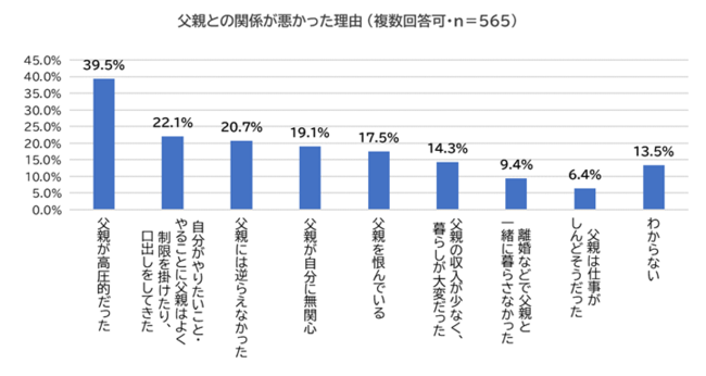 父親との関係が悪い人は、なぜ関係が悪くなったのでしょうか?最多回答は「父親が高圧的だった」(39.5%)となり、「自分がやりたいこと・やることに父親はよく制限を掛けたり、口出しをしてきたりした」(22.1%)、「父親には逆らえなかった」(20.7%)と続きました。