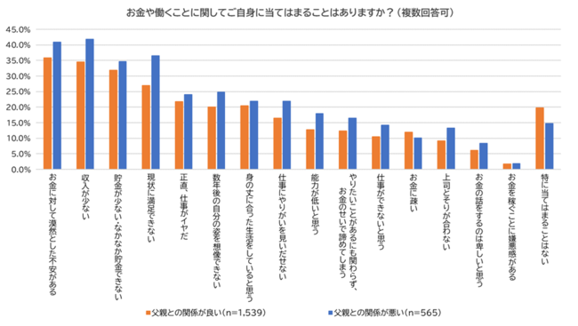 父親との関係が悪いと答えた人の方が、父親との関係が良いと答えた人よりもお金や働くことに関連する悩みを多く抱える傾向があることがわかりました。この相関関係には、以下の2点の背景が要因として考えられます。