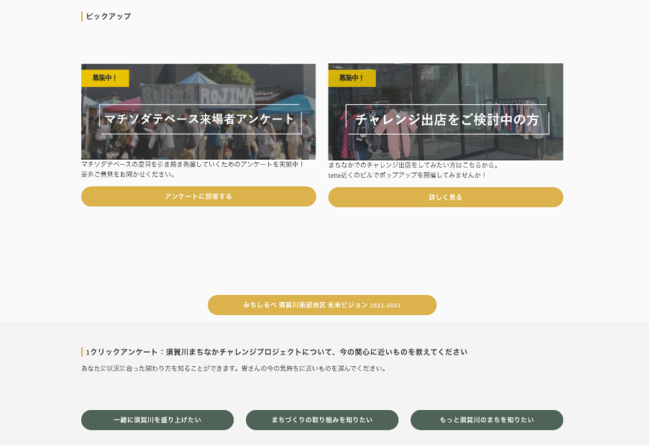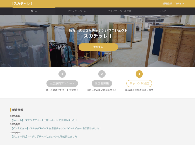 「スカチャレ!」は、チャレンジショップ「マチソダテベース」の活動を中心に、だれもがチャレンジできる場、滞在したくなる憩いの場を作るまちづくりを推進するオンラインプラットフォームです。市民や出店者、関係人口の巻き込みを推進することを目的とし、プロジェクトの概要や、ワークショップ情報、出店者インタビューなど、さまざまな情報を地域内外に向けて発信していきます。ユーザーはアカウント登録をすることで、プロジェクトの進捗やイベント情報などのお知らせを受け取ったり、意見・アイデアを投稿したりすることができる双方向型投稿サイトです。