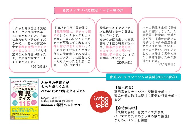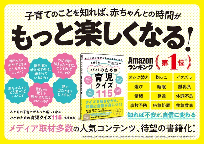 「育児クイズパパ力検定」で紹介されているクイズやコラムを厳選してまとめた書籍『ふたりの子育てがもっと楽しくなる パパのための育児クイズ115』(高橋幸恵・著/株式会社クロスメディア・パブリッシング)を2023年1月に出版し、ふたりの子育てを大切にしていきたいパパさんママさん、お孫さんが生まれる方など多くの方に楽しんでいただいています。