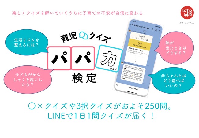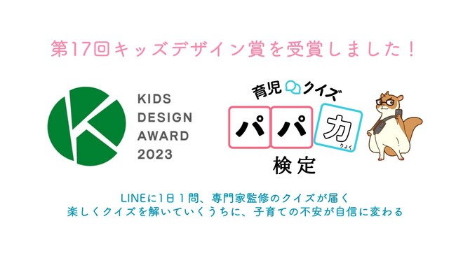 育児に役立つ知識を楽しいクイズ形式で提供し、パパの育児・ふたりの育児を応援している「LINEで1日1問育児クイズパパ力検定(以下、育児クイズパパ力検定)」が、第17回キッズデザイン賞(主催:特定非営利活動法人キッズデザイン協議会 後援:経済産業省、内閣府、消費者庁、こども家庭庁)を「子どもたちを産み育てやすいデザイン部門」において受賞しました。