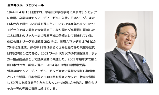「この度は日本サッカー界のレジェンドである釜本邦茂氏にアンバサダーに就任いただく縁をいただき、大変嬉しく思います。私たちの挑戦はまさに始まったばかりですが、フットボールの発展の一端を担えるよう、これからさらにグローバルを舞台に従来の枠にとらわれない施策を仕掛けていく予定です。日の丸を背負い、様々なタイトルを懸けて戦ってこられた釜本氏に教えを乞いながらアンバサダーとして協力いただけることは、国外でも挑戦する私たちの心強い後押しになります。私たち自身も学ぶ姿勢を忘れず、日々チャレンジしていきたいと思います」
