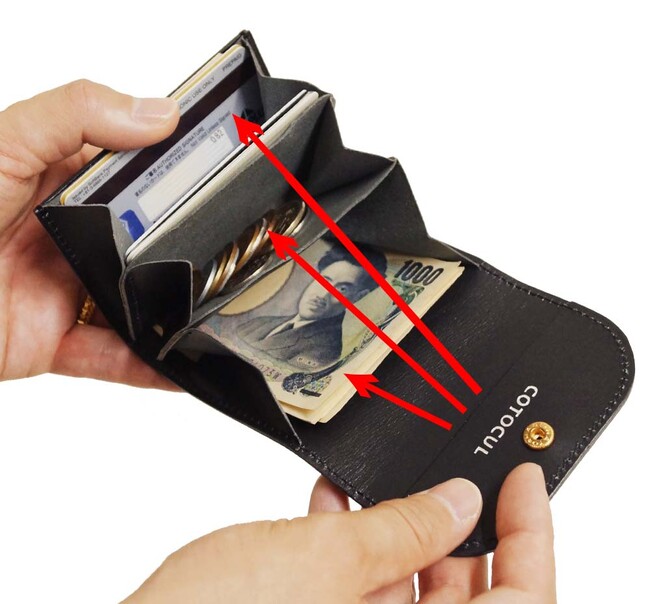 お札を折らずに収納できる独自構造【意匠登録第1598276号】、小型なのにカードや小銭の出し入れ簡単。小型化と実用性を両立させたのがCOTOCULのミニ財布