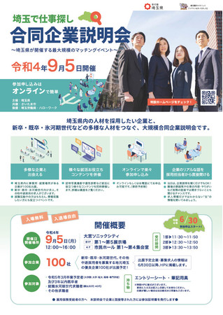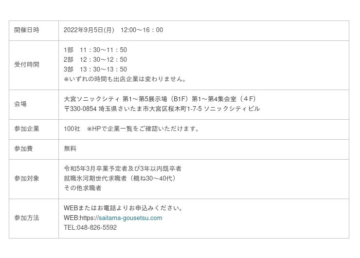 埼玉県内の企業と、新卒・既卒・氷河期世代など多様な人材をつなぐ、大規模合同企業説明会を大宮ソニックシティで9月5日(月)に開催します。