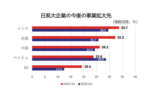 日本貿易振興機構(JETRO)の2024年度 「日本企業の海外事業展開に関するアンケート調査」によると、インドは今後の事業拡大先として、アメリカ、中国、EU、ベトナムに次いで第5位となっています。特に大企業では、インドでの事業拡大意欲が33.7%と、32.2%のアメリカを超えて最大になっています。