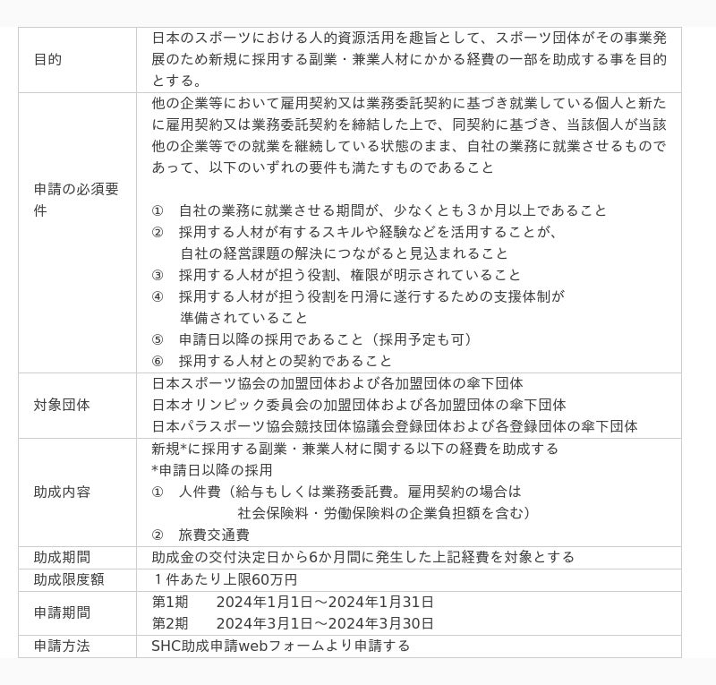 公益財団法人スポーツヒューマンキャピタル(代表理事:本間浩輔)は、スポーツ団体を対象に、新規に採用する副業・兼業人材の人件費助成を行います。