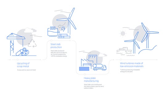 低排出スチールは、ベルギーのインダスティール・シャルルロワにあるアルセロールミタルの製鋼所で、動力源を100%風力エネルギーとする電気アーク炉で溶融したスチールスクラップを100%使用して製造されます。スチールスラブはその後、スペインのヒホンにあるアルセロールミタルの厚板工場で、風力タービンタワーの製造に使用される重量鋼板に加工されます。低排出スチールで作られたこれらの重量鋼板は、当初は陸上風力タービンタワー全体と洋上風力タービンタワーの上部への使用に適しています。低排出厚板鋼は、独立機関によって認証された環境製品宣言(EPD)を取得し、製品の完全な環境フットプリントが詳細に記載されており、製品間の比較が容易になります。