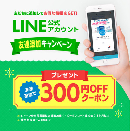お得なSALE情報や、ショップ情報をお届けしているレンズダイレクトのLINE公式アカウントを友達登録していただくと300円OFFのクーポンをプレゼント中です。
