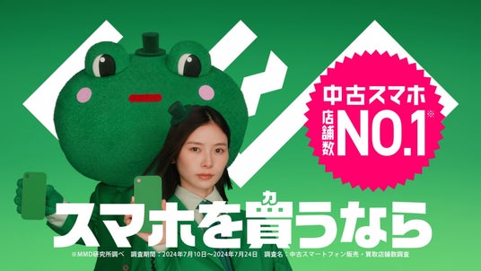 株式会社ゲオ(本社:愛知県名古屋市中区、代表取締役社長:吉川恭史)は、朝日奈央さんを起用した新TVCM『中古スマホがお得にカエル』篇を9月23日(月)より全国で放送いたします。CM本編では、昨年に引き続き3度目の出演となる朝日さんと、本CMで初登場となるカエルのキャラクターが中古スマホがお得に“買える”ことや、お手軽に格安SIMに“変える”ことができること、手続きが簡単なのですぐに持ち“帰る”ことが可能なことなど、ゲオで中古スマホを買える魅力をお伝えします。同日にはロングバージョンのWEB CMも公開いたします。
