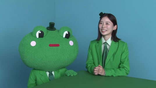 A.かわいいですね~。かわいいですけど、すごくチャキチャキされてて可愛らしさとすごく仕事ができる感じのギャップに凄く魅力を感じます。今回カエルのキャラクターと一緒にお仕事できて今まで以上に楽しい撮影になりました。(カエルと顔を見合わせて)二人でもね!息ぴったりだったからね!この息ぴったりな感じが皆さんにも伝わっているんじゃないかなと思います!
