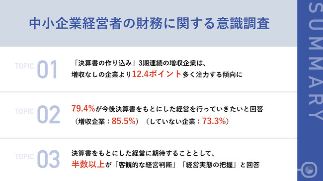 「決算書の作り込み」を3期連続の増収企業は、連続で増収していないの企業より12.4ポイント多く注力していることが分かりました。また、多くの中小企業が、「客観的な経営判断」や「経営実態の把握」をするために、今後決算書をもとにした経営を行っていきたいと回答しました。なお、今後、決算書をもとにした経営を行いたいと回答した経営者は、3期連続の増収企業が12.2ポイント高い結果となりました。