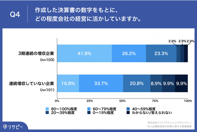 「Q4.作成した決算書の数字をもとに、どの程度会社の経営に活かしていますか。」と質問したところ、3期連続の増収企業(n=103)は「80~100%程度」が41.8%、「60~79%程度」が26.2%、連続増収していない企業(n=101)は「80~100%程度」が16.8%、「60~79%程度」が33.7%という回答となりました。