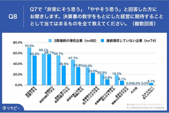 Q7で「非常にそう思う」「ややそう思う」と回答した方に、「Q8.決算書の数字をもとにした経営に期待することとして当てはまるものを全て教えてください。(複数回答)」と質問したところ、3期連続の増収企業(n=88)は「経営実態を把握できる」が70.5%、「客観的な経営判断ができる」が59.1%、連続増収していない企業(n=74)は「客観的な経営判断ができる」が58.1%、「経営実態を把握できる」が55.4%という回答となりました。