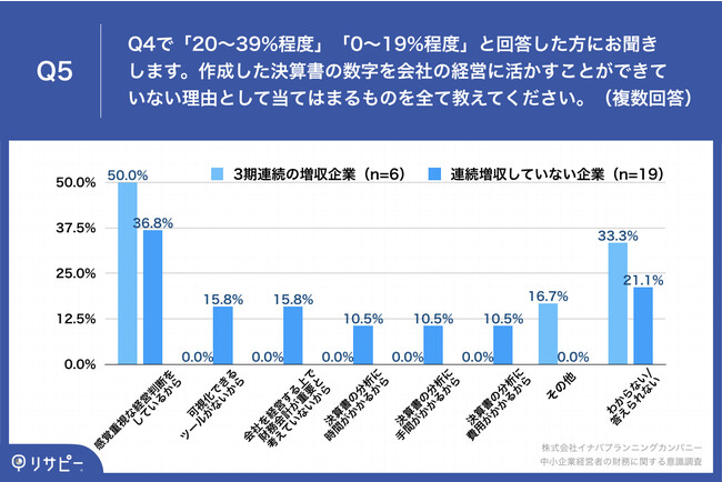 Q4で「20~39%程度」「0~19%程度」と回答した方に、「Q5.作成した決算書の数字を会社の経営に活かすことができていない理由として当てはまるものを全て教えてください。(複数回答)」と質問したところ、3期連続の増収企業(n=6)は「感覚重視な経営判断をしているから」が50.0%、「その他」が16.7%、連続増収していない企業(n=19)は「感覚重視な経営判断をしているから」が36.8%、「可視化できるツールがないから」が15.8%、「会社を経営する上で財務会計が重要と考えていないから」が15.8%という回答となりました。