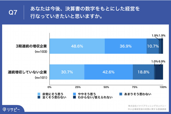 「Q7.あなたは今後、決算書の数字をもとにした経営を行なっていきたいと思いますか。」と質問したところ、3期連続の増収企業(n=103)は「非常にそう思う」が48.6%、「ややそう思う」が36.9%、連続増収していない企業(n=101)は「非常にそう思う」が30.7%、「ややそう思う」が42.6%という回答となりました。