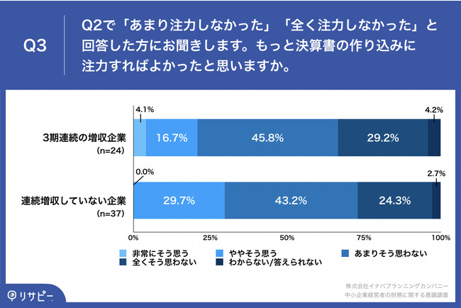 Q2で「あまり注力していなかった」「全く注力していなかった」と回答した方に、「Q3.もっと決算書の作り込みに注力すればよかったと思いますか。」と質問したところ、3期連続の増収企業(n=24)は「あまりそう思わない」が45.8%、「全くそう思わない」が29.2%、連続増収していない企業(n=37)は「あまりそう思わない」が43.2%、「全くそう思わない」が24.3%という回答となりました。