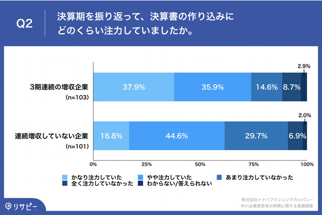 「Q2.決算期を振り返って、決算書の作り込みにどのくらい注力していましたか。」と質問したところ、3期連続の増収企業(n=103)は「かなり注力していた」が37.9%、「やや注力していた」が35.9%、連続増収していない企業(n=101)は「かなり注力していた」が16.8%、「やや注力していた」が44.6%という回答となりました。