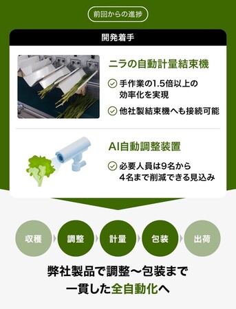 現在は、顧客のニーズに基づきながら、計量後にテープやゴムでの結束まで自動で行う「ニラの自動計量結束機」の開発も行っています。現在開発中の試作品は、作業者3名で24束/分の処理を可能とし、手作業の1.5倍以上の効率化を実現しています(弊社調べ)。また、既存の他社製結束機やそぐり機(ニラの外葉を取り除く作業)と接続して、弊社の計量機をさらに安価に導入できる方法も検討しています。さらに、AIカメラを用いて作物を判別したのち、組み合わせ計量機へ振り分けを行う自動調整装置の開発に着手しています。この製品が開発できれば、今までの装置と組み合わせることによって、出荷における調整・計量・包装(または結束)までを一貫して全自動化できる予定です。従来では9名必要としていた農家では4名まで人員を削減できると見込んでおり(弊社調べ)、従事者不足に苦しむ農家に大きく貢献できると考えています。