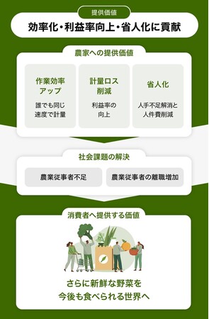 弊社は、小~中規模の農家でも導入しやすい価格帯の計量機を提供することで、出荷作業の効率化をはかり、農業と家族の生活を両立できる働き方の実現を目指しています。一時的な負担の大きさが原因で辞めてしまうケースを減らし、利益率をあげることで、農業就業者の増え続ける離農に歯止めをかけ、いつまでも鮮度が高く美味しい野菜が食べられる世界をつくりたいと考えています。