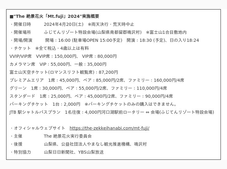 The 絶景花火実行委員会(所在地:東京都渋谷区、代表:磯本 幸生)は、"世界文化遺産・富士山の敷地内にある絶景ポイントで、最高の花火を"をコンセプトに掲げる、春の花火エンターテイメント"The 絶景花火「Mt.fuji」2024"(以下、「絶景花火」)は、3種類の花火観覧チケットを開催地である山梨県鳴沢村のふるさと納税返礼品として登録・受付を開始いたしました。本返礼品はイベントや体験型チケットなどのエンタメチケットのみを返礼品としたエンタメチケット専門ふるさと納税サイト "ふるチケ" にて、2024年3月11日(月)~4月9日(火)の期間受付いたします。「絶景花火」は花火観覧チケットをふるさと納税返礼品に登録することで、イベントの開催を通じて開催地となる山梨県鳴沢村の地方創生、地域の活性化にも寄与してまいります。