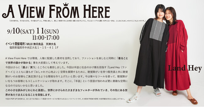 「地球環境への配慮と伝統工芸・美しい手仕事の良さを伝えるモノづくり」をコンセプトに展開している、レディースアパレルブランド『A VIEWFROM HERE』が9月10日11日の2日間 無印良品 天神大名にてPOP UP SHOWをオープン致します。