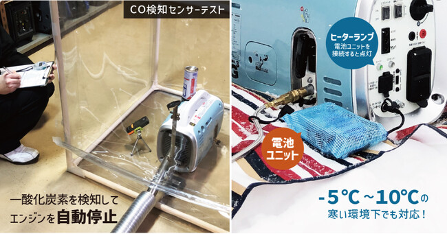 特徴はガス気化ヒーターとCOセンサーを搭載していること。-5℃の寒冷地でも通常通りに使え、一酸化炭素中毒による事故も防ぐことができる賢い発電機です。