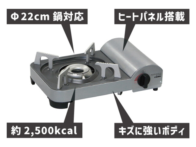 ミドルサイズでありながら火力はおよそ2,500kcal。直径約22cmまでの鍋に対応しており、家族4人分の食事を作るのに十分役立つカセットコンロです。また、ヒートパネルを搭載することで貴重なガスを無駄にせず使い切ることができます。