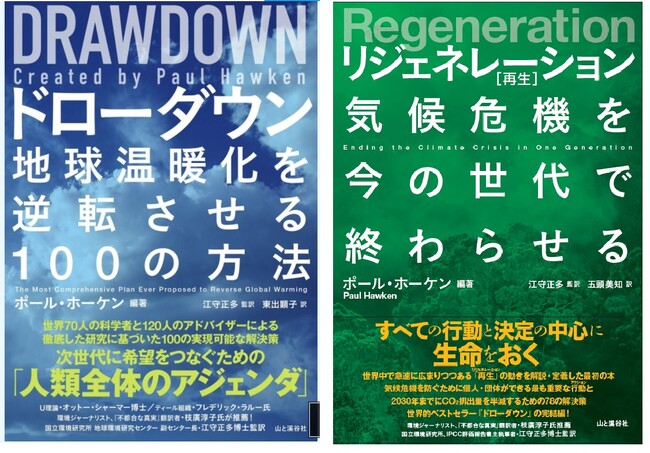 社会起業家/環境活動家であるポール・ホーケン氏によって著された「ドローダウン 地球温暖化を逆転する100の方法」(以下「ドローダウン」)と「Regeneration リジェネレーション[再生]気候危機を今の世代で終わらせる」(以下「リジェネレーション」)には、気候危機を防ぐために個人・団体ができる最も重要な行動が示されています。
