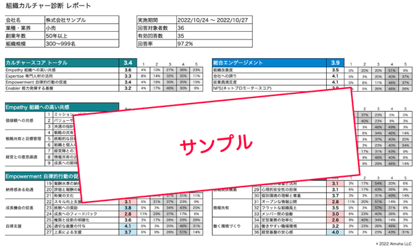 組織課題を特定するための組織開発ツール「Startup Culture Survey」は、「スタートアップらしい組織カルチャーとは何か」を定義した12のテーマに基づき策定した36の診断項目をもとに、急成長するスタートアップに必要な組織カルチャーになってるかを把握し、組織の強みと課題を浮き彫りにします。自社の診断結果をもとに、自組織の課題を経営陣・人事担当が把握することで、低いスコアがあった場合に何をすればいいかが端的に把握できるため、人材・組織の課題に直面して成長に苦しむスタートアップが事業成長するため具体的な施策に役立てることができます。