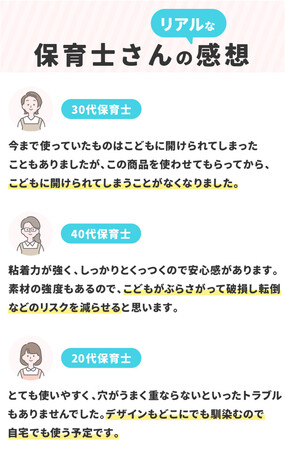 保育士さんへのアンケートの中で、放課後デイサービスなどの、要療育のこどもを扱う施設でもドア開放防止は問題となっていて、回すタイプのものを是非使いたいとの声をいただきました。回すタイプの「Safty Straps」は多くのシーンで活用できそうです。是非手に取って効果を確認していただきたいです。