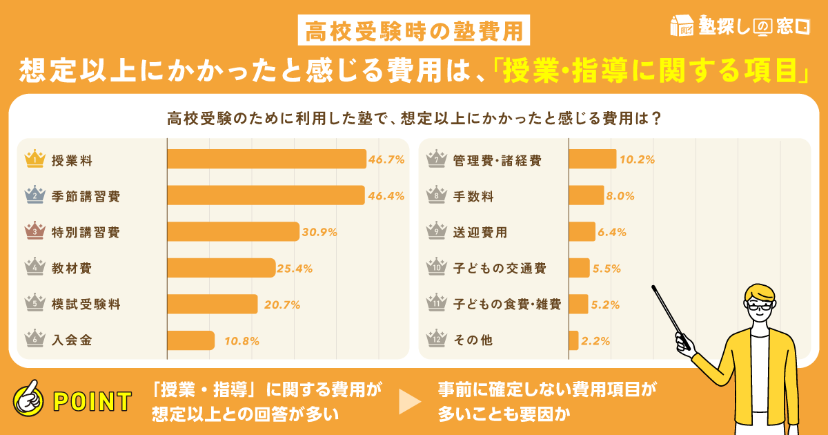 調査対象のうち、塾(集団指導塾:58.0%、個別指導塾:38.1%)を利用したと回答した保護者に、「塾でかかった費用のうち、想定以上に高かった費用項目」を尋ねました。結果は以下のとおりです。