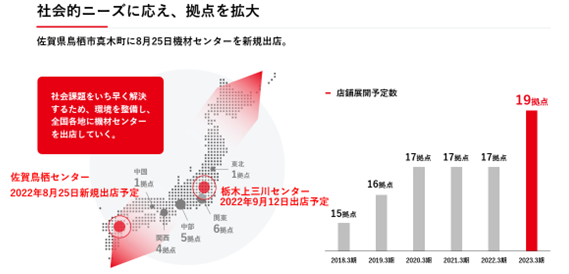 いち早く解決するためには、お客様へ貸し出すための足場機材の保有量拡大に加え、「いつでも、近くで、安心して」借りていただける環境を整備し、全国各地に機材を提供する機材センターの新規出店が必要不可欠だと考えます。
