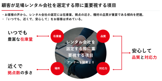 当社は毎年お客様よりアンケートを取得しておりますが、お客様が足場のレンタル会社を選定する際に、最も重要視する点が、「いつでも、近くで、安心して」借りることが出来るという3点でございます。特に、「近くで借りることが出来る」が強く求められています。