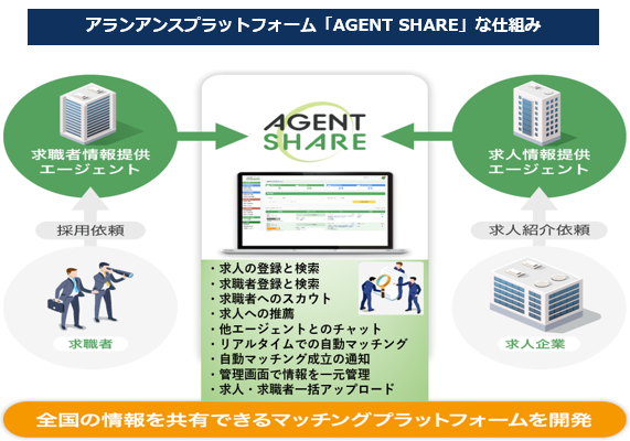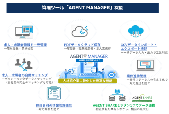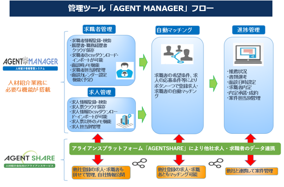 株式会社エージェントシェア(本社:東京都中央区、代表取締役:金子歌穂)は、日本全国の人材エージェント同士で求人と求職者の情報を共有でき、連携して就職支援ができるアライアンスプラットフォーム「AGENT SHARE」に、自社の求人・求職者の管理と「AGENT SHARE」へのデータの自動連携が可能な人材紹介会社向け管理ツール「AGENT MANAGER」の提供を開始しました。