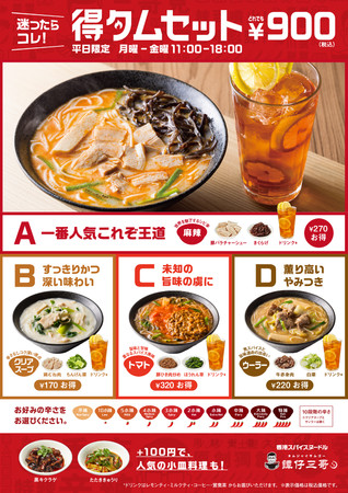 株式会社トリドールホールディングス(東京都渋谷区、代表取締役社長 兼 CEO 粟田 貴也、以下、トリドールHD)の傘下グループ企業「株式会社譚仔日本」は、平日11:00-18:00限定で、『譚仔三哥(タムジャイサムゴー)』にて米線+具材2種+ドリンクの選べる4種セットを900円で提供する“得タムセット”を開始いたします。