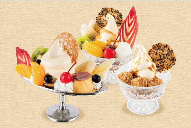天美卵をたっぷり使った大江ノ郷自然牧場のプリンを使った「クリーム ア・ラ・モード」をはじめ、あんみつやわらび餅、コーヒーゼリーなど、ソフトの美味しさを楽しめるスイーツをご用意しました。