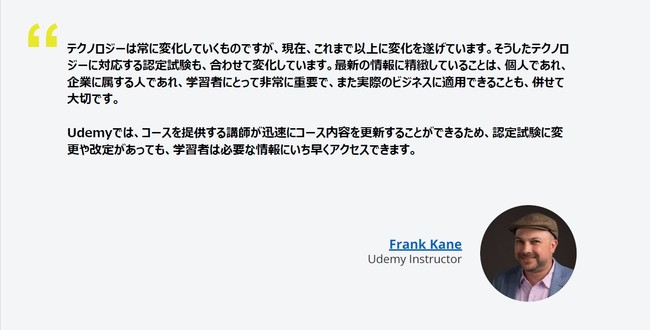 Udemy(ナスダック:UDMY)は、組織や個人のスキルを高めることを目的として柔軟で効果的な能力開発の場を提供しています。個人向けのUdemyのマーケットプレイスプラットには、数十カ国以上で何千もの最新講座があり、学習者、講師、企業がそれぞれの目標や最大の可能性を達成するのに必要なツールを提供しています。プログラミングやデータサイエンス、そしてリーダーシップやチームビルディングに至るまで、何百万人もの人々がさまざまなトピックについて、各分野の専門家からUdemyを通じて学んでいます。法人向けのUdemy Businessでは、定額で何千もの講座や学習分析ツール、自社コンテンツの配信機能を含む受講管理システムを提供しており、Glassdoor、On24、世界銀行、フォルクスワーゲンなどの世界的企業が利用していますUdemyはサンフランシスコに本社を置き、トルコのアンカラ、テキサス州オースティン、マサチューセッツ州ボストン、カリフォルニア州マウンテンビュー、ダブリン(アイルランド)、メルボルン(オーストラリア)、ニューデリー(インド)、サンパウロ(ブラジル)にハブ機能を備えたオフィスを構えています。